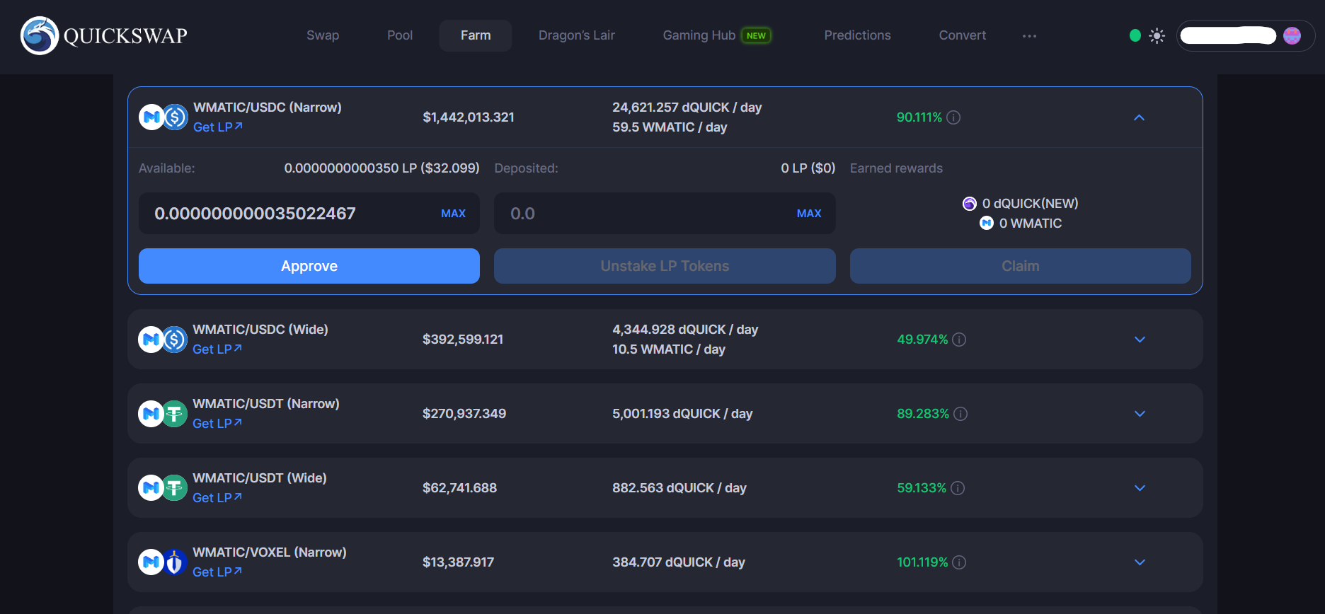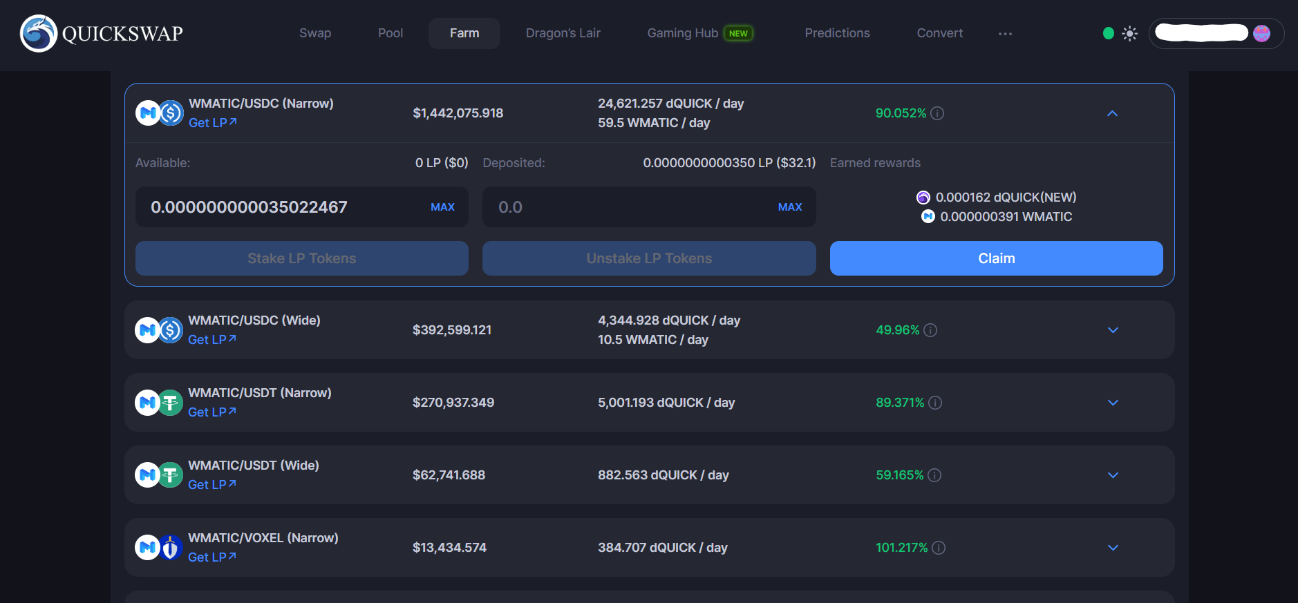 3. Your LP tokens have now been staked and youβll immediately begin earning farming rewards in dQUICK and WMATIC (or whichever reward token the farm provides).