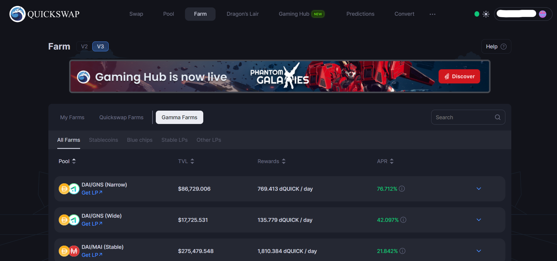 1. Go to https://dapp.quickswap.exchange/farm?chainId=8453. Next, either stay on the Gamma Farms page (default) or click on QuickSwap Farms (regular V3 farms).